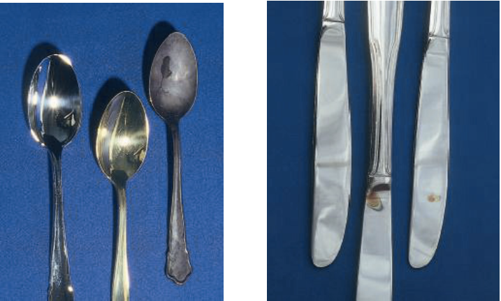 As peças de prata ou alumínio podem ficar pretas por reação com o ar, enxofre e água. Quando estas peças são lavadas, podem deixar depósitos pretos noutras peças, nos cestos e em todo o interior da máquina de lavar loiça. Algumas peças de prata possuem apenas um revestimento fino de prata e não devem ser lavadas na máquina de lavar loiça.